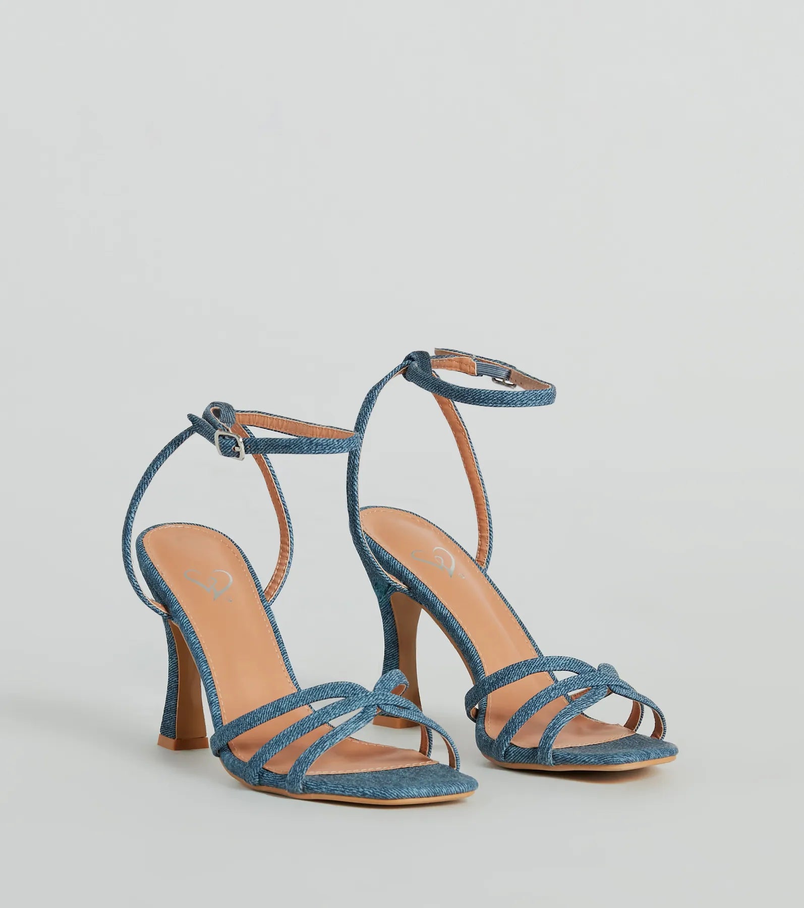 Trendy with chic details. these denim print faux leather heels are a staple for the season. Designed with a medium-wash denim print on smooth faux leather material. these heels are a fabulous must-have! They feature an open square-shaped toe with a thin strappy design across the foot. thin adjustable ankle and heel straps with a buckle closure. and a stiletto heel. Pair with the matching shoulder bag for a seamlessly stylish 'fit!