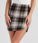 It's feeling like the season of plaid! Create a cute and casual outfit with this crepe mini skirt featuring a high-rise waist. bodycon silhouette. and a flirty slit accent. Complete the look with a denim jacket.