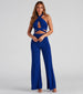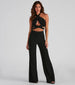 Behold the secret to looking sultry on the go is this halter wrap jumpsuit! Featuring a sleeveless. open-back bodice with neck tie-back closure. cutout accents. a high-rise waist. and a flared silhouette. Complete the look in sleek big hoop earrings for a gno.
