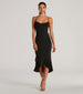 This sleeveless midi dress will be your favorite secret weapon for a chic look at parties or nights out! The spaghetti straps and cowl neckline accentuate your curves. while the bodycon fit flatters your figure. With an asymmetrical tiered ruffle midi-length hem. this dress is sure to make a statement. Complete the look in strappy block heels.