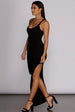 Get seductive in this slinky maxi dress. This black dress features a round neckline . a sleeveless bodice and an attached belt with a gold detail. This long dress is comprised of a ribbed material that offers moderate stretch and side slit.