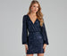 You're the queen of sparkle in this sequin mini dress! It features puff long sleeves along the v-neckline with a surplice accent and bodycon skirt. The knit-lined fabric offers a moderate stretch. Complete the look with chic booties.