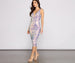 Sparkle and shine in a dress that brings the glamour to your evening. Alina features a sleeveless V-neckline with a sheer mesh inset. tank-like straps. an iridescent sequin scroll print. and a midi length silhouette. Aline is composed of a lined mesh fabric that offers a form hugging fit with a slight stretch. Complete your formal outfit with glitter heels and a dainty rhinestone bracelet.Â