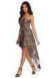 Stand out like the fierce fashionista you are in our Serena dress! She features a sleeveless sweetheart neckline. a built in no slip strip and padded cups. Her relaxed fit bodice leads to head turning high low silhouette that is complemented with a contrast lining. Serena is composed of a textured satin fabric. Dress offers a form hugging fit with minimal stretch. Includes a back zipper closure and mini skirt length knit lining.