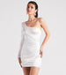Seriously cute for every semi-formal event this season! Slay in this satin mini dress featuring a one-shoulder neckline. a single long fitted sleeve. bodycon fit. asymmetrical hem. and a back cutout with a lower ruched seam to flaunt your curves. Complete the look with sleek hoop earrings.