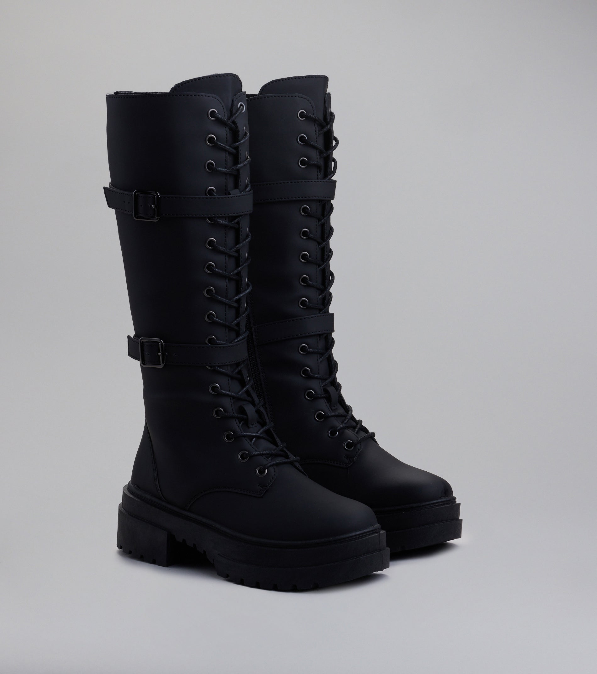 Command the room before you even speak. These under-the-knee combat boots feature a lace-up front. buckle straps. and a platform lug sole. Perfect for leveling up your day-to-night looks!