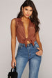This rust bodysuit  is sophisticated by day. and can turn sexy by night! This versatile top has an open front with a tie front detail at the hem. a fold over collar. and a relaxed fit. Bodysuit is composed of a satin-like fabric. Includes a thong bottom with snap button closure.