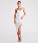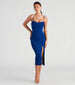 Strut in confidence in this sultry-sophisticated crepe midi dress featuring a sleeveless cowl neckline with sleek spaghetti straps. a form-fitting silhouette. a front slit. and a low-cut back to showcase some skin! Complete the look with a glam necklace and heels.