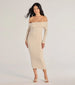 Strike a fierce impression in a ribbed knit dress with an asymmetrical off-the-shoulder neckline. a pleated popover accent. fitted long sleeves. and a midi-length hem. Complete the look with strappy heels for the perfect work-to-happy hour look!Â