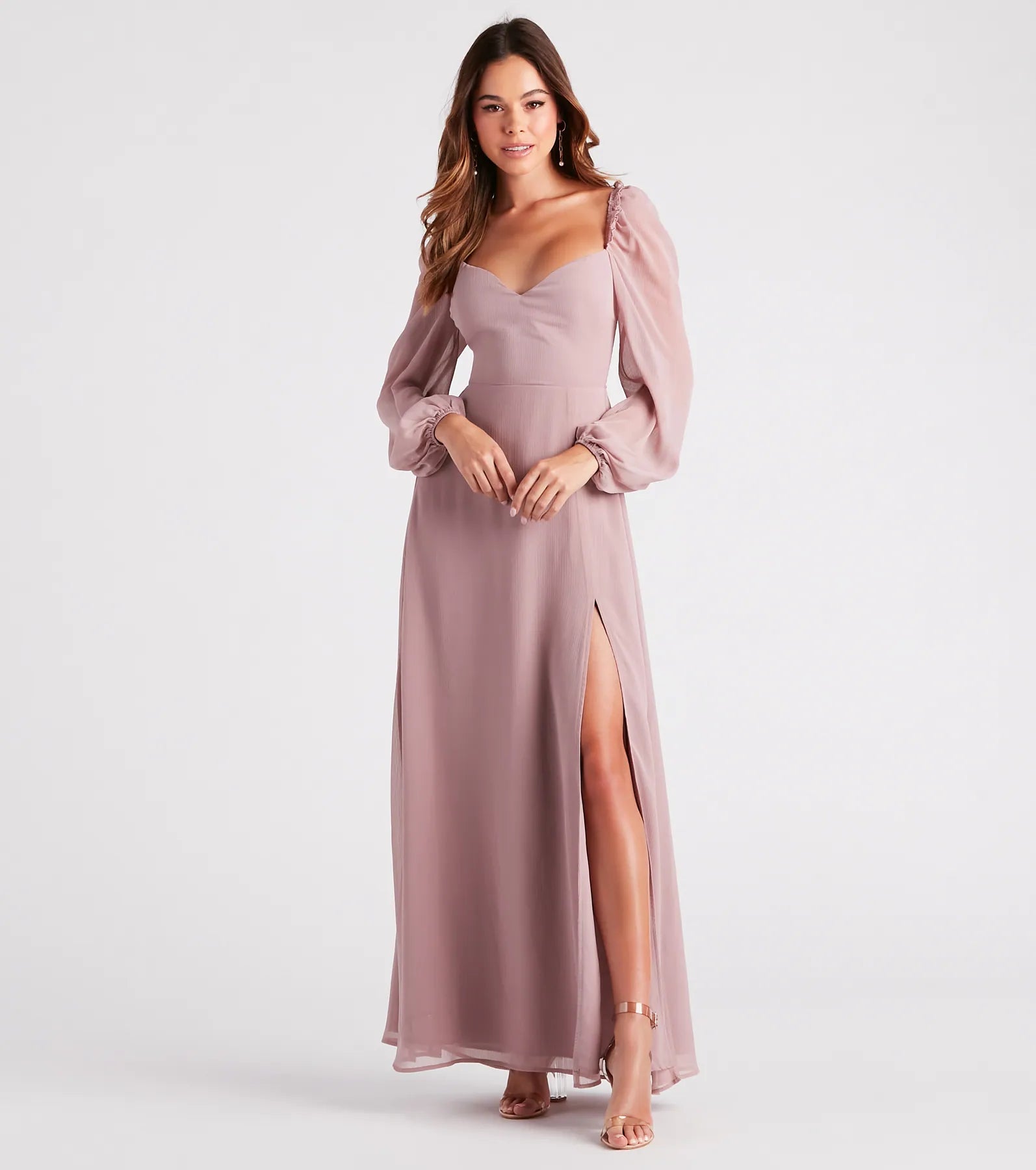 Everyone will marvel at you looking like beauty in this chiffon maxi dress perfect for wedding showers or dressy dates! It features sheer peasant long sleeves. a sweetheart neckline with a padded bust. a smocked back. and a flowy long hem with a front slit. The dress is composed of airy chiffon fabric with a smooth woven lining. Complete the look in chic heeled sandals.