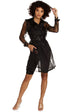 Have a party in this trendy. black trench coat! It has a flat collar paired with a double breasted front that features a single storm flap and belted waist. The long sleeve garment is composed of a sheer. organza fabric and includes front pockets with faux flaps.