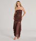 Sheer and perfect. this strapless maxi mesh dress offers a sheer asymmetric shark hem and a flowy silhouette. Pair with stilettos.