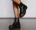 These boots were made for a baddie look you. girl! The boots feature a mid-calf length. an inner zipper closure. lace-up front. and a lug sole. The boots are composed of a faux leather material. Complete your look with a moto jacket and skinny leg jeans.