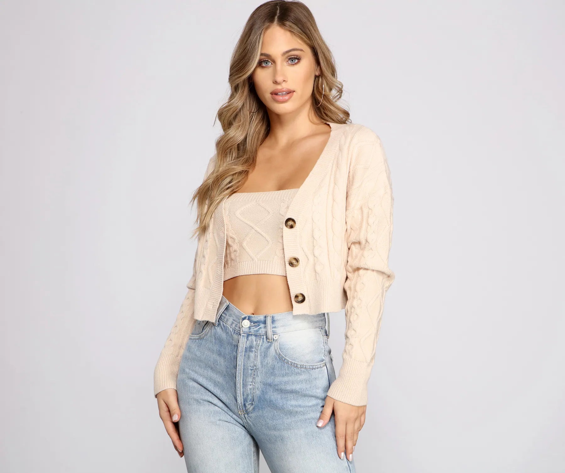 Here's looking at you. babe! Let this cardigan take the spotlight of your trendy outfit! The cardigan features an open-front. a multi-button down front. long sleeves. a cropped hem. and composed of a cable knit fabric. Complete your look with the matching crop top and high waist jeans for an effortlessly cool girl look.