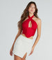 You'll be so snatched and ready for the night in this figure-flaunting bandage crop top! It features a sleeveless halter neckline with a trendy criss-cross front design. a revealing center cutout at the bust. a bustier-style bodice to create a cinched silhouette with flexible boning for structure. and a fitted. angled. and cropped hem. The bandage knit fabric offers a smooth and sculpted look. Style this top with a mini skirt and platform heels.