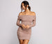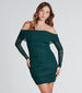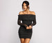 Glow on. girl in a dress that brings the shimmer and glamour to your next night out! The dress features an off the shoulder neckline with a popover detail. sleek long sleeves. and composed of a glitter knit fabric. Complete your look with rhinestone duster earrings.