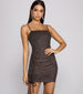 Shine on in this glitzy dress that brings the dazzle. The mini dress features a sleeveless square neckline. ruched side seams for a customized fit. and is composed of a glitter knit fabric. Complete your look with rhinestone earrings.