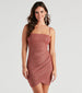 Shine on in this shimmering mini dress that puts you in the spotlight. The mini dress features a sleeveless bodice with a square neckline. sleek spaghetti straps. and a ruched mini-length silhouette with an asymmetrical hem. The dress is composed of a glitter knit fabric that offers a form-hugging fit with a moderate stretch. Complete the look with rhinestone earrings.