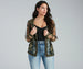 Show em' who's boss in this commanding camo bomber! The jacket features a drawstring hood. long sleeves with cinched cuffs. a complete zip front. front pockets. and an elastic banded hem. Pair this trendy jacket with a basic crop top and biker shorts for a casual-chic look.