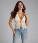 This embroidered halter top is your go-to for chic afternoons. It boasts a skin-baring V-neckline and sheer split bodice that flaunts your figure!Â