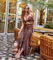 Serve major allure in this sleeveless maxi dress while on vacay or weekend getaway! The maxi dress delivers a sultry design with a twist plunge V-neckline. cutout bodice. and a high front slit with a ruffled trim.