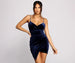 Wrap yourself in a luxe velvet dress that brings the sophistication to your night out. The dress features a plunging V-neckline. sleek spaghetti straps. and a mini length silhouette with an asymmetrical hem. The dress is composed of a velvet knit fabric that offers a form hugging fit. Complete look with a dainty rhinestone bracelet.Â