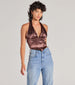 This silky sleek satin top features a V-neckline with tie-back halter straps and a partially smocked back for added stretch. The cropped hanky hem and form-hugging fit will create a snatched silhouette.