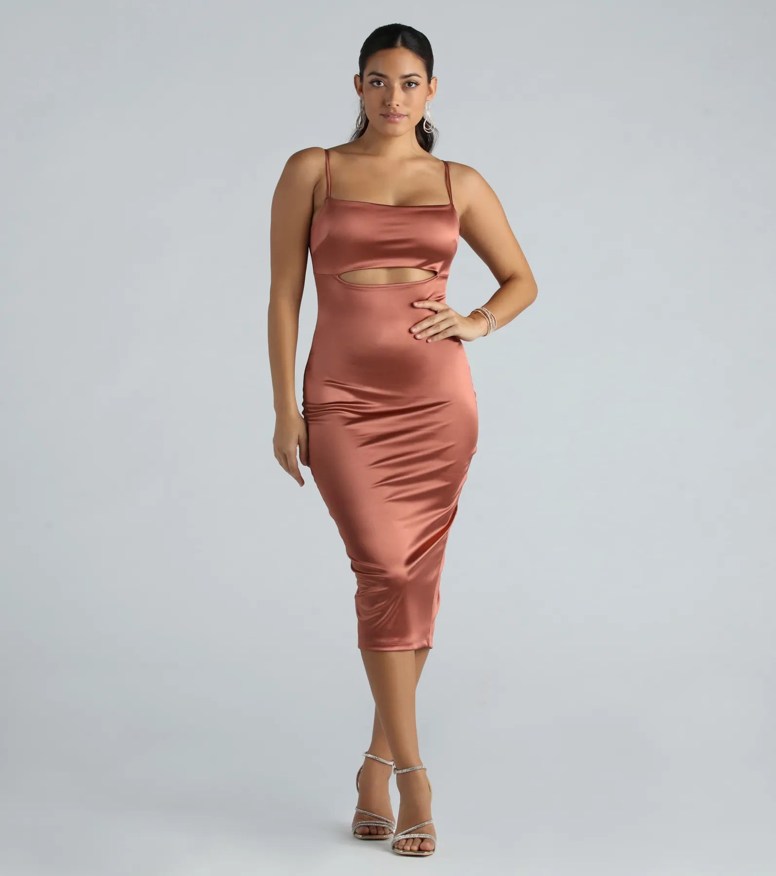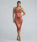 Slip into the Simone formal satin midi dress for a sultry vibe at banquets or weddings! She features a square neckline adorned with spaghetti straps. a tie-back design. a flirty underbust cutout. a center back slit. and a bodycon silhouette that hugs your curves down to the knee-length midi hem. The formal midi dress is crafted from a luxuriously soft satin fabric with minimal stretch. Complete the look with a mini purse and heels.
