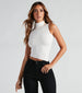 This simple yet chic crop top is a closet staple. It features a sleeveless turtleneck with a fold-over design. a cropped. asymmetrical hem. and a form-hugging fit. The soft sweater knit fabric offers a moderate stretch. Style with high-rise denim and ankle booties.