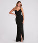 Radiate glamour with a dress that showcases your affinity for the luxe life. Skyler features a sleeveless V-neckline with padded cups. vertical seams at the bust. adjustable spaghetti straps. and ruching at the waist. Her slim-fit bodice leads to a curve-hugging A-line silhouette with a high side slit. The dress is composed of a lined crepe fabric that offers a form-hugging fit with a moderate stretch. Complete look with glitter heels and a clutch.