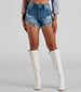 Slay the denim trend in these flattering high-rise shorts featuring distressed accents. a v-cut silhouette. and a raw frayed hem on premium vintage-inspired medium wash denim fabric with cool color fading. Complete the look in a sultry bustier for a summer night out.