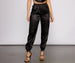 Keep it sleek in satin joggers to dress up your casual tops for a night out! The joggers feature an elastic high waist. a sleek straight leg. and tapered elastic hem. The joggers are composed of a luxe satin-like fabric that offer a form hugging fit with minimal stretch. Complete look with a rhinestone bustier.