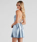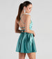 Sleek and flirty. this smooth satin skater dress is a stunning choice. It features a sleeveless cowl neckline with pleated detailing. spaghetti straps. and an open-back lace-up design. The high waist seam flows out to a short skater skirt with hidden side pockets perfect for keeping your hands warm. Style this dress with sparkly rhinestone earrings.