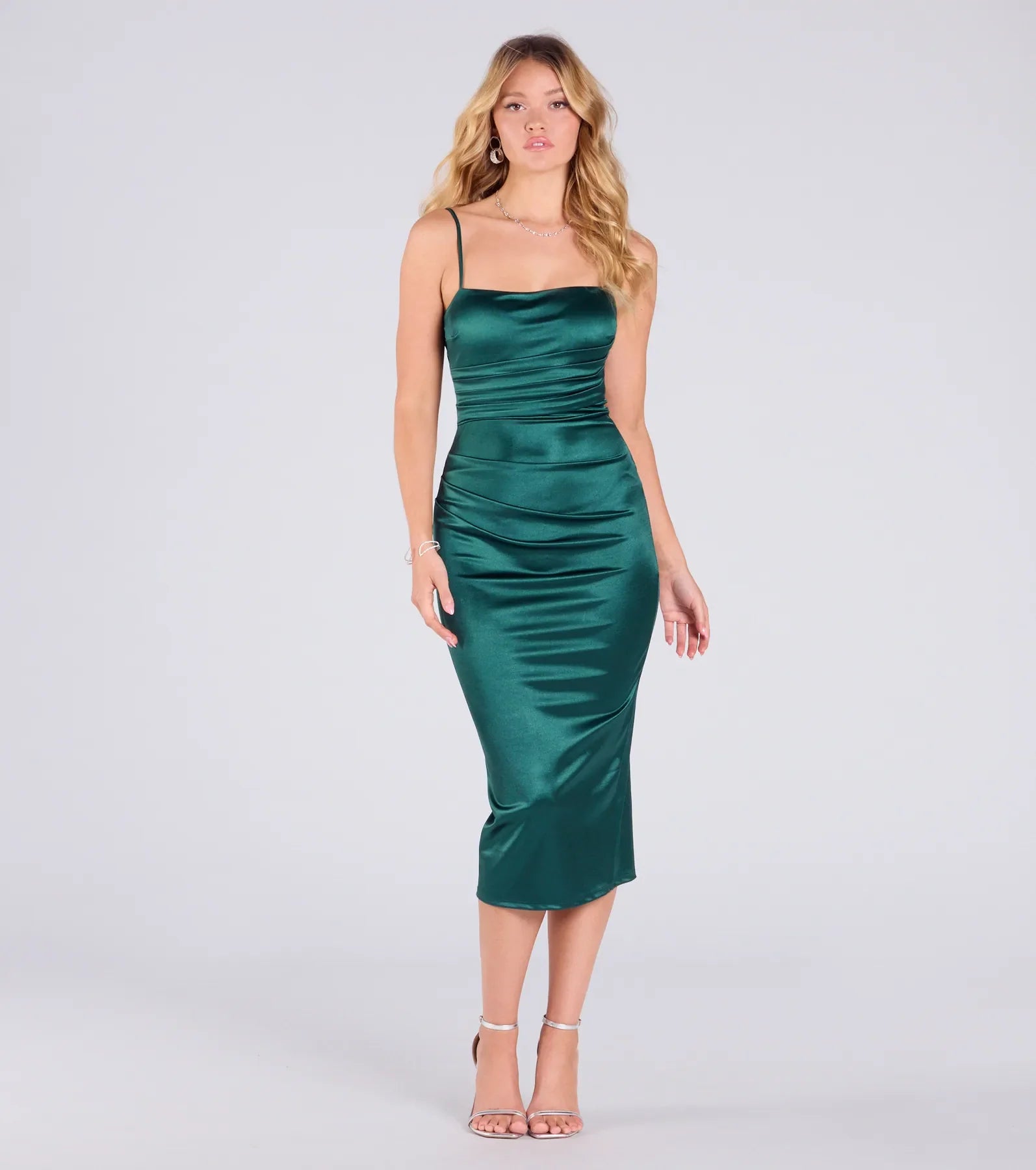 Sleek and iconic. this satin-knit midi dress is perfect for a cocktail party or date night! The asymmetric pleating under the bust and at the waist will highlight your curves while the back slit adds some movement to the bodycon silhouette.