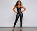Keep it sleek with a catsuit that dares to go bold! The catsuit features a sleeveless V-neckline. spaghetti straps. and a skinny leg fit. The catsuit is composed of a faux leather fabric that offers a form hugging fit with a moderate stretch. Complete look with sleek stiletto heels.