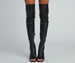 Keep your look sleek and stunning with boots that dare to show off your bold style! The boots feature a thigh-high fit. an inner zipper closure. an open back. a peep toe with a square-shaped platform. and a sleek stiletto heel. The boots are composed of a faux leather material. Complete look with a knit sweater and skinny jeans.