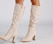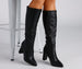 Step up your winter wardrobe with these sleek and trendy below-the-knee boots. They feature a pointed toe. an inner zipper closure. and a block heel. Style these boots with a sweater dress and a chic trench.