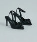 Add a sleek charm to your dressy look with these satin rosette stiletto pumps. They feature a closed pointed toe with a trendy rosette applique accent. an open back with thin adjustable ankle and heel straps. and a tall stiletto heel. The pumps are composed of a satin woven material with a faux leather subtle cushioned insole. Style with a rhinestone mesh clutch for your next cocktail party.
