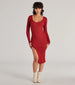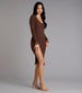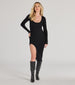 Accessorize a ribbed knit midi dress for the perfect fall outfit. The dress features a plunging V-neckline. long fitted sleeves. and a bold high slit. Complete your outfit with thigh-high boots.