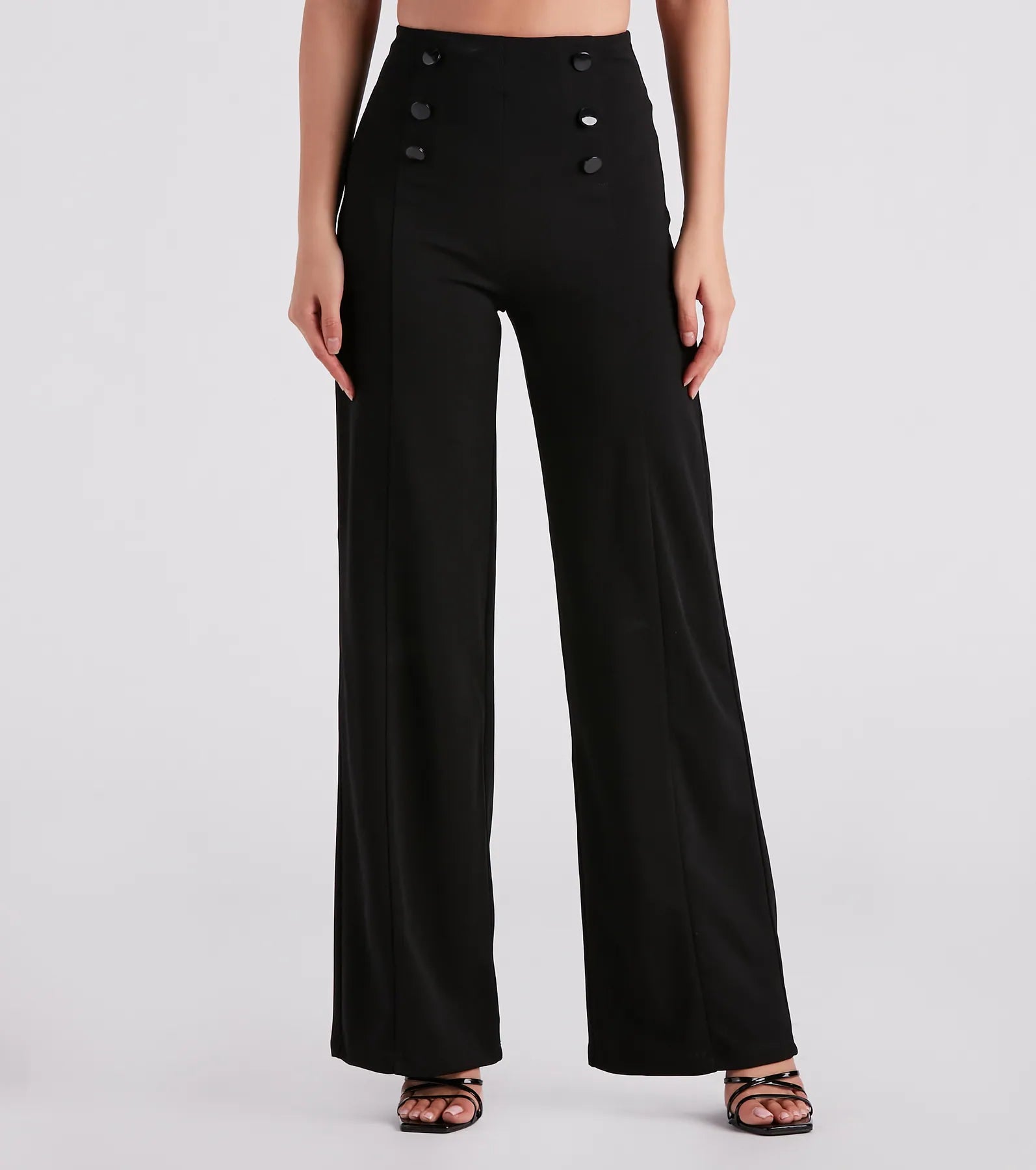 Your sleek silhouette awaits once you slip into these crepe high-rise pants featuring trendy six-button front accents and a wide-leg silhouette. Style with a basic bodysuit and pumps for a workwear outfit or networking.