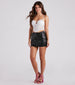 Show off a sleek style for your next night out with the girls in this trendy faux leather mini skirt! It features a high-rise waist with an asymmetric cross-over design. a front button closure. two front and back pockets. a mini-length hem. and a form-hugging fit. Complete the look with a corset top and strappy heels.