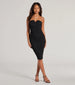 A sophisticated mesh midi dress perfect for cocktail hour! It features a strapless sweetheart neckline. chic cowl overlay. and bodycon fit. Pair with heels and a clutch.