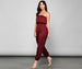 Create a sleek and chic look in this strapless satin jumpsuit. It features a straight-across neckline. a high-rise cinched elastic waistband. side pockets. and relaxed-fitting pant legs with a tapered jogger hem. Take this look from day to night by layering on a faux leather jacket and pairing it with strappy heels.