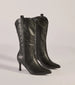 Sleek and trendy will be your vibe in these mid-calf faux leather boots with a western stitched design. They feature a pointed toe. a complete inner zipper closure for effortless styling. and a stiletto heel.
