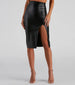 Show off a sleek and stunning look in this trendy faux leather midi skirt! It features a flattering high waist. a mid-length curve-hugging fit. and a sultry high front slit. Style this skirt with the matching crop top and clear heels for your next night out.
