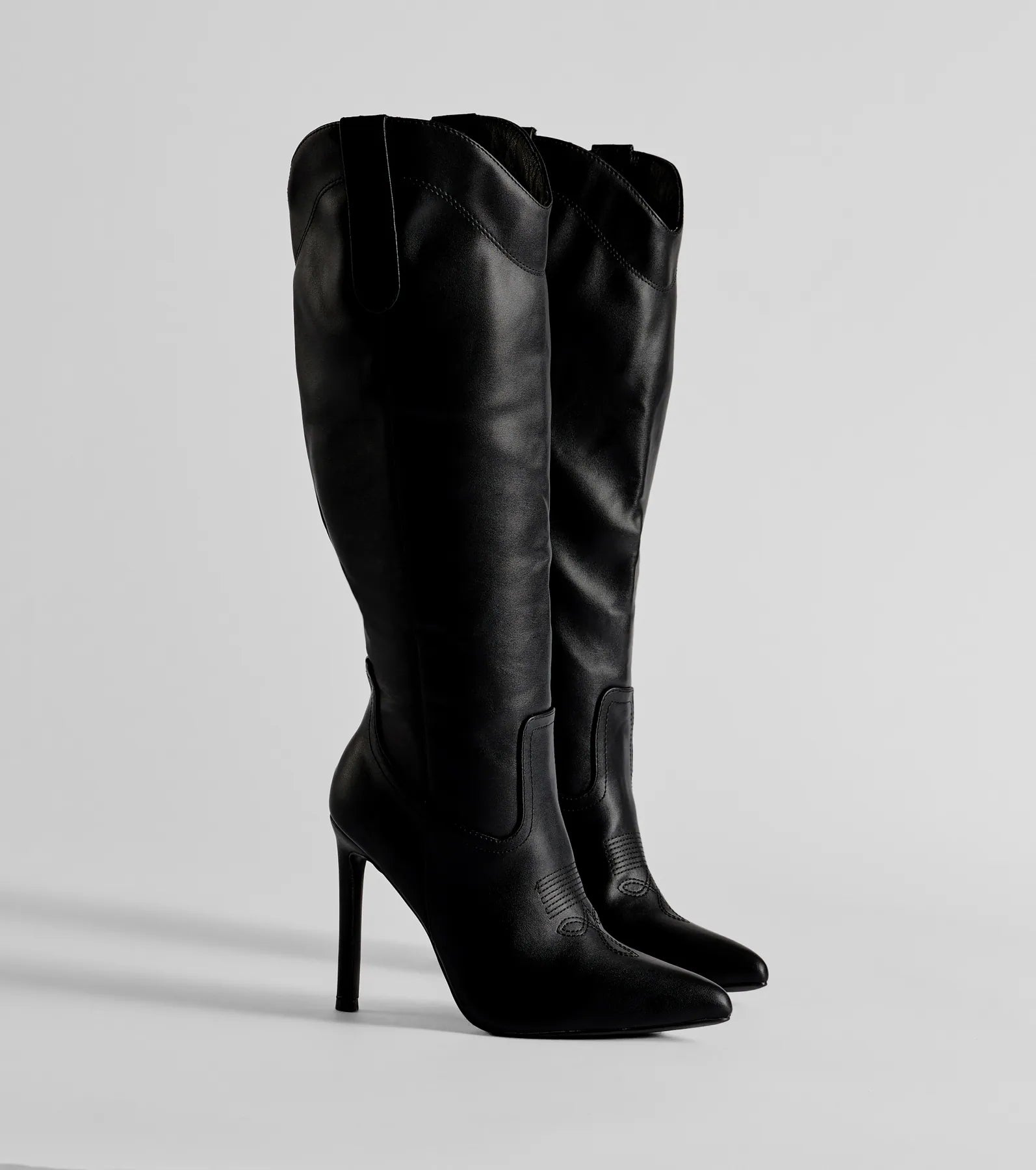 Step up your game this season in these western under-the-knee boots showcasing a sleek stiletto heel to elevate every outfit.