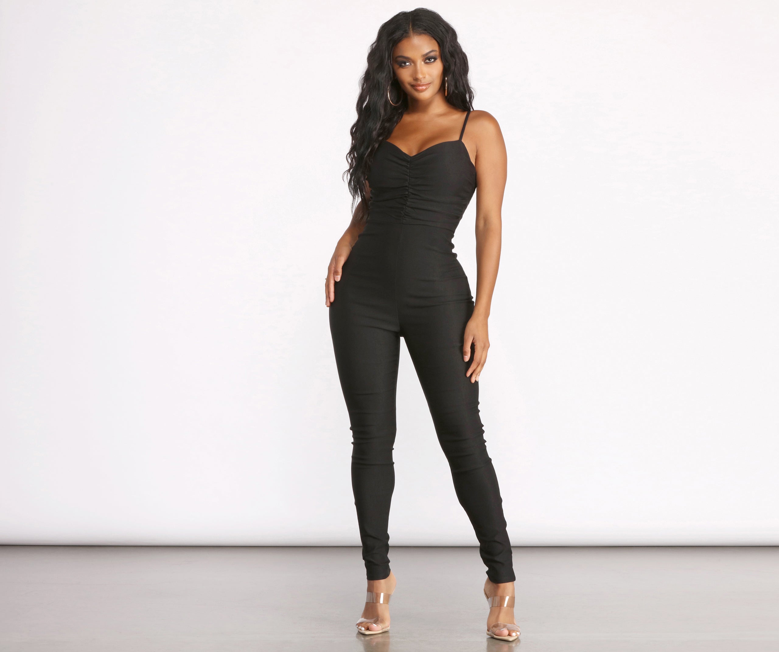 Stun all in a ruched tapered catsuit. Swap out your LBD for a fierce catsuit that features a sleeveless sweetheart neckline. partially-open back. spaghetti straps. and a ruched- detailed bodice. The relaxed fit bodice leads to a skinny leg fit with a tapered hem. Dress up catsuit with open-toe heels and dramatic hoop earrings.