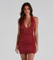 This slinky and chic halter mini dress will give you a gorgeous curve-hugging silhouette. It features a sleeveless V-neckline. halter straps. ruched detailing down the sides and back. and a mini-length hem. The smooth slinky knit fabric offers plenty of stretch. Style with strappy heels.
