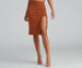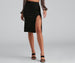 This faux suede midi skirt happens to be very stylish for coffee runs and beyond! It features a high-rise waist. front slit accent. zipper closure. and a fitted midi hem. Complete the look with chic booties and a handbag.