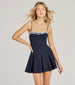 Smooth ponte knit fabric shapes this sleeveless mini dress featuring a lace bow trim square neckline. spaghetti straps. and a fitted silhouette that leads to a pleated flare mini-length hem.